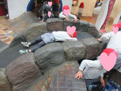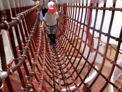 幼稚園だけでは体験できない様々な遊具がありました。もも組さんは、はじめは「怖いよ…」と言っていましたが、友達が楽しそうに遊ぶ姿を見て、「やってみる!」と挑戦していました。友達から刺激を受けながら遊ぶ中で、バランスを保ちながら歩いたり、ジャンプしたりして体を動かして遊ぶ楽しさを存分に味わうことができました。