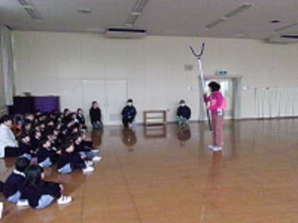 今日は不法侵入に備えての避難訓練を行いました。もしも不審者が幼稚園にやって来たらということを想定しながら、どうやって逃げたら安全なのかをクラスでも話し合いました。みんなで避難した後に、園長先生からのお話を聞いたり、さすまたを見たりしました。子どもたちはとても真剣な表情で話を聞いて取り組むことができていました。