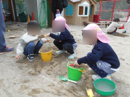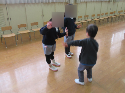 はなぐみ・ももぐみの子どもたちは、新しいお友達が遊びに来てくれたことに大喜びでした。コップをかける場所やトイレの場所など、幼稚園の生活に関することを教えてくれました。そして、準備が終わったら、園庭で一緒に遊びました。「これで遊ぶ?」「これおもしろいよ」など声をかけて、遊びに誘っていました。園庭でたくさん遊んだ後のリズム室での全体会では、新しいお友達の名前を知ったり、一緒に仲良し遊びをしたり歌を歌ったりしました。「一緒に遊ぼう!」と誘いかけて、音楽に合わせて楽しそうに遊ぶ姿が見られました。