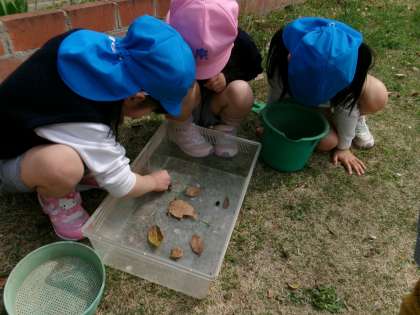 虫探しが得意なそら組さんは、「ダンゴムシさん見つけよ!」と嬉しそうに手のひらにのせて見せてくれました。その姿を小さい友達が興味をもって見ていると、「触ってみる?」「こちょこちょ歩くんだよ♪」と教えてあげたり、一緒に遊びに誘いかけてくれたりして、自然と異年齢で関わる姿が見られました。