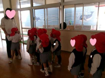 新しい友達も増えたので、みんなで園内探検に出かけました。昨日の帰りに次の日の予定を話していたので、今日は登園後に「先生、今日は園内探検に出かけるんやろ?」と覚えていて、朝から楽しみにしていたようです。