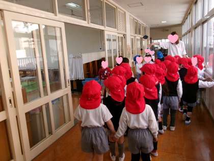 進級児が中心になって、新しい友達や今年から赴任した担任の先生に「ここはな、お茶つくってくれたり、玩具なおしてくれるお部屋やねん」「ここはそら組さんのお部屋やよ」と率先してお話ししてくれる姿も見られました。とても、頼もしかったです。新しいお友達も、幼稚園の事がいろいろと分かって、安心したようです。