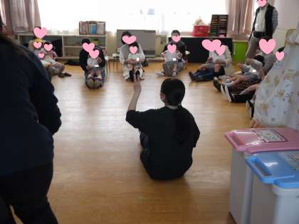 そら組さんは、先生のピアノに合わせて表現遊びを楽しみました♪はな組さんは、2人組になって友達となかよし遊びをしたり、歌をうたったりしました。もも組さんは、おうちの人一緒にふれあい遊びを楽しみました♪