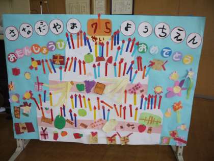もも組さんもはな組さんもそら組さんも先生も、4月生まれの誕生児のおうちの人も力を合わせて75本のロウソクを飾り、大きな大きなおたんじょうびケーキが完成しました♪「真田山幼稚園おめでとう!」