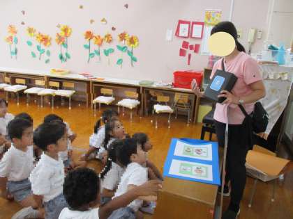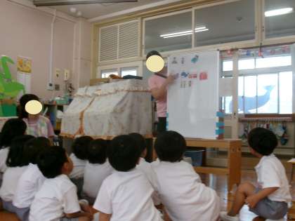 そこで、くじら列車のお話をしました。「9時までに寝るとみんなが寝ている間に『くじら列車』が迎えに来て[背が伸びる][体が元気になる]プレゼントがもらえるよ。9時を過ぎて、遅くまで起きていると、『くらげ列車』が迎えに来て、[元気がなくなる]プレゼントをもらえるよ。どっちのプレゼントが欲しいのか聞いてみると、「元気になるプレゼントがいい!」との声がたくさんあがりました。