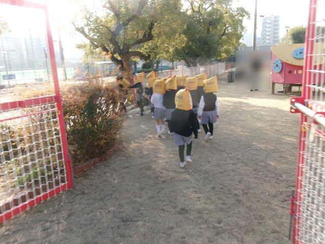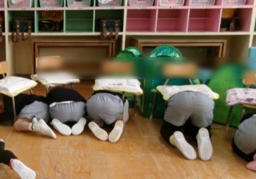 「地震が起きました。」と放送が聞こえると、ダンゴムシポーズをしたり、防災頭巾をかぶって真田山公園の安全な場所に避難したりと真剣に取り組む姿が見られました。その後、津波警報が出た想定で、高い場所にある幼稚園のリズム室に2次避難しました。みんな落ち着いて避難訓練に参加することができました。