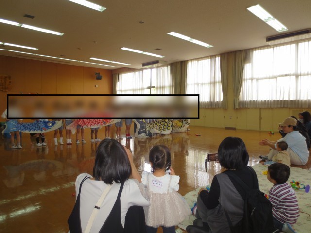 大きな鯉のぼりを見せながら「こいのぼり」の歌を歌いました。二曲目は、お散歩に出かけたくなるような楽しい歌の「ジグザグお散歩」を歌いました。