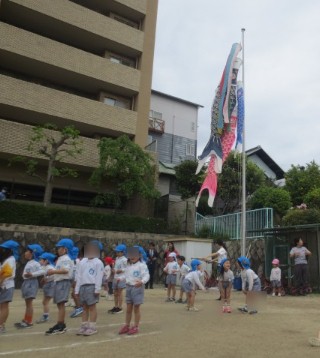 こいのぼりが泳ぐ園庭で、友達と一緒になかよし遊びや体操を楽しみました。