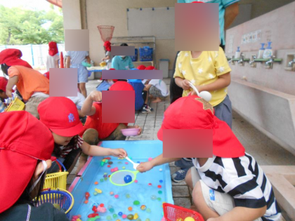 子どもたちがずっと楽しみにしていた水遊びをしました。 スーパーボールや魚をすくっ...