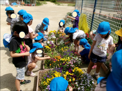 園庭に咲いている花を摘んで、色水遊びをしました。 ビニール袋の中に、好きな色の花...