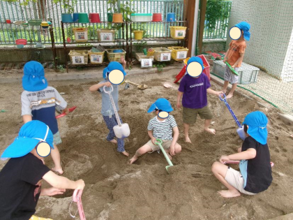 砂場に大きな穴を一生懸命掘っている子どもたち。 「先生見てて〜」手押し車やバケツ...