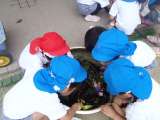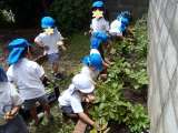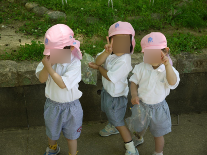 3歳児は、友達や保護者と一緒に公園内の草花や木の実を拾って遊びました。幼稚園には...