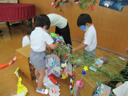 今日は七夕です。各クラスで、四角つなぎや貝殻つなぎ、輪つなぎやスイカなど、いろい...