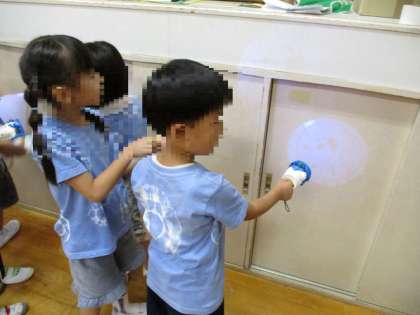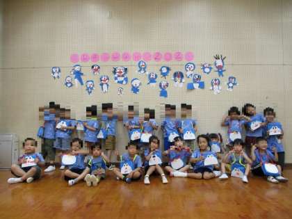 5歳児すみれ組が、事前に絞り染めをして作ったお揃いのTシャツを着て参加しました。