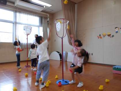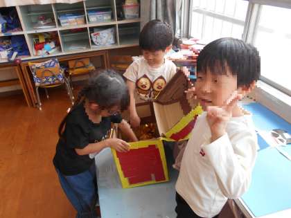 すみれ組が作った船に乗ったり、お宝迷路に挑戦したりして楽しんでいます。