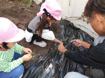 11月7日 たまねぎの苗を植えました 公開日 2024/11/08 更新日 2024/11/08 園生活の様子 クイズです。 皮は茶色くて、中身は白い。 丸くて、カレーな中によく入っている野菜はなんだ?! 「たまねぎ!!」 畑に玉ねぎの苗を植えました。 細い苗ですが、玉ねぎのにおいがする!と子どもたちは驚いていました。 未就園児活動「ももちゃんらんど」に遊びに来ていたお友達も植えてくれましたよ。 大きくなーれ♪ いいね(0)