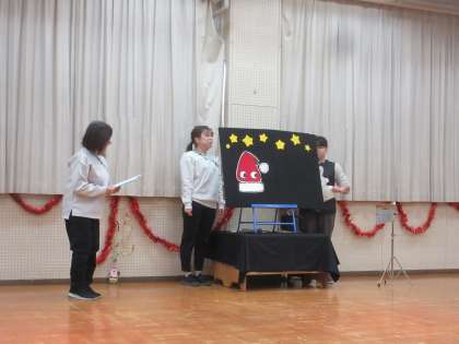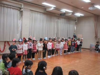 すみれ組の子どもが歌と楽器遊びを披露してくれたり、先生からのパネルシアターのお話のプレゼントを聞いたりしました。