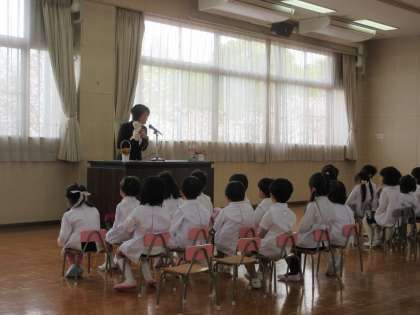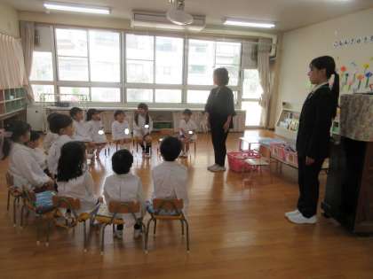 先生から新しい名札をつけてもらうと、嬉しそうに名札を眺め、進級したことを喜んでいました。