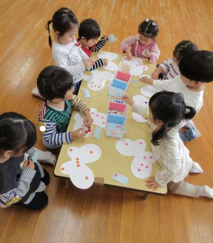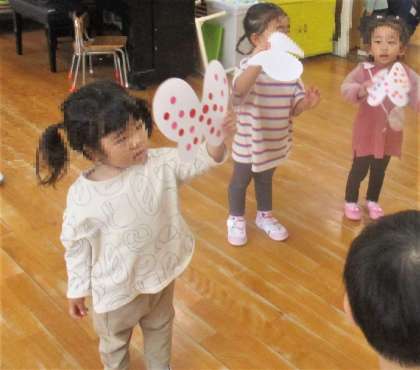 できたチョウチョウをもって、ひらひら飛ばしてみたり、「見て見て!」と先生や友達に見せたりする姿が見られました。