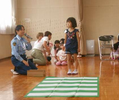 信号の意味や止まれの標識について教えていただいた後、模擬横断歩道を渡りました。