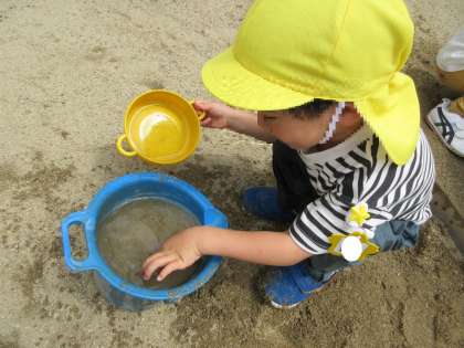 砂場で何度も水をくんだり、流したりして遊んでいました。