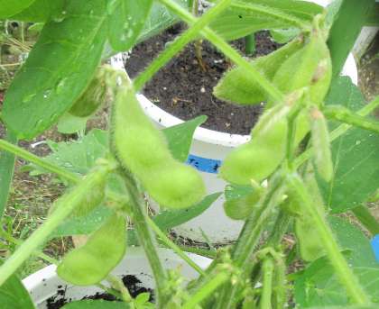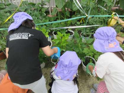 「オクラに つぼみがひとつできてる!」「おまめが おおきくなってきたよ」と友達と伝え合っていました。