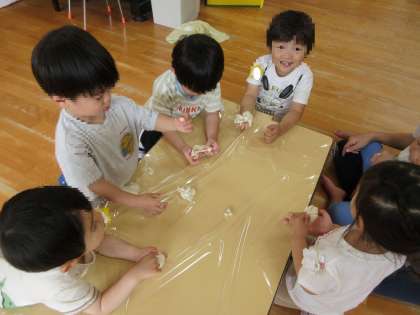 小麦粉粘土で遊ぶたんぽぽ組の子どもたち。