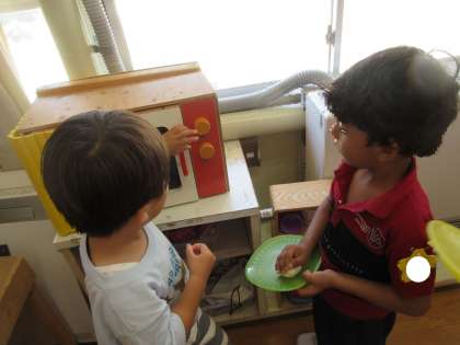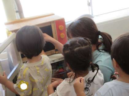 「あれで焼きたい!」と、ままごとの電子レンジで焼いて遊ぶ姿が見られました。