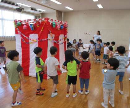 6月27日 子どもたちの様子 公開日 2025/06/28 更新日 2025/06/28 園生活の様子 みんなで準備をし、リズム室に櫓が設置されて、お祭り気分でいっぱいの子どもたち。 櫓の周りに集まって、盆踊りとダンスを踊りました。 夏祭りが楽しみになりましたね! いいね(0)
