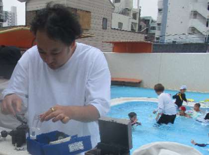 園の薬剤師の先生が、プールの水質検査に来てくださいました。