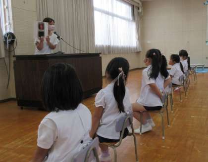 警察の方からお借りした信号機や標識の絵を使いながら、話をしました。