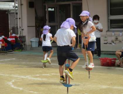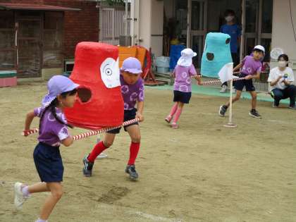 幼稚園最後の運動会!すみれ組は、色々な運動遊具にチャレンジしました。一輪車やホッピング、縄跳びなど、最後まで諦めずに何度も何度も挑戦していました。当日の子どもたちの表情は達成感を味わい、輝いていました。リレーや、だるま運びなどの競技も、一人一人が真剣に取り組み、頑張りました。
