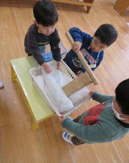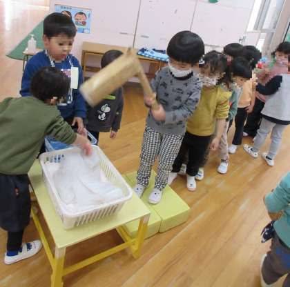 餅つきが楽しくて、「もっとしたかった」という子どもたちの声から、保育室でも餅つきごっこをして遊んでいます。