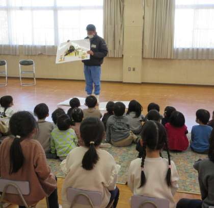 可愛いイラストの紙芝居で、子どもたちも興味津々で話を聞いていました。