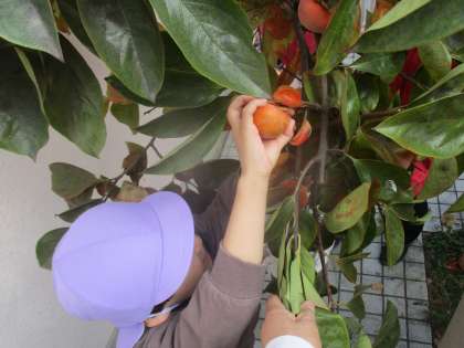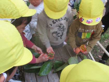 通園路から見える柿が、だんだんと色づいてくることに気づいていた子どもたちは、今日の日を楽しみにしていました。
