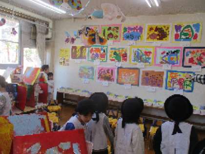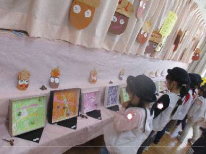 明日の「あじはらこどもカーニバル」を前に、子どもたちが園内の作品や絵画を見て回りました。