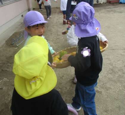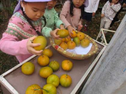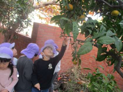すみれ組の子どもたちが、幼稚園の裏庭に実ったミカンを収穫しました。