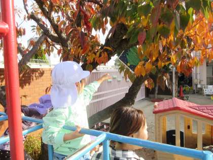 木の上にある何かを見つけたすみれ組の子どもたち。知らせを聞いたみんなが集まってきました。「たんぽぽに知らせないと!」「さくら組にも!」と、保育室に走っていきました。