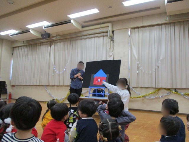 3つ目は、先生からの”パネルシアター”の出し物。お家の中に誰が住んでいるのか、サンタさんと一緒に考えました。