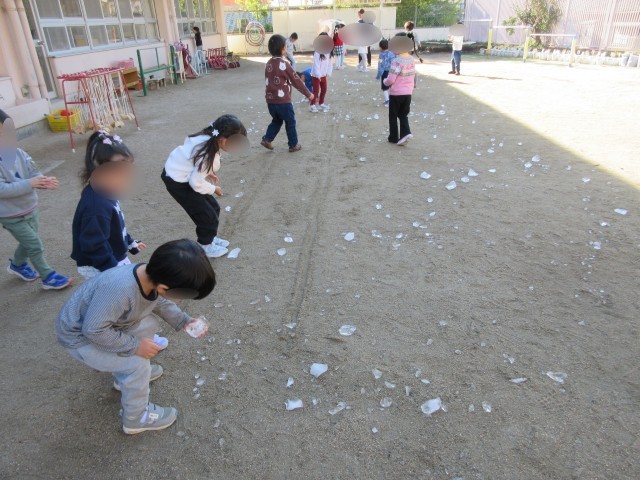 サンタさんが帰ったあと、園庭には、ソリの跡と、氷がありました。