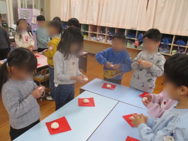 保育室に戻った子どもたちは、お餅つきの日につくった自分たちの鏡餅に願いを込めながら、それぞれの鏡開きをしました。