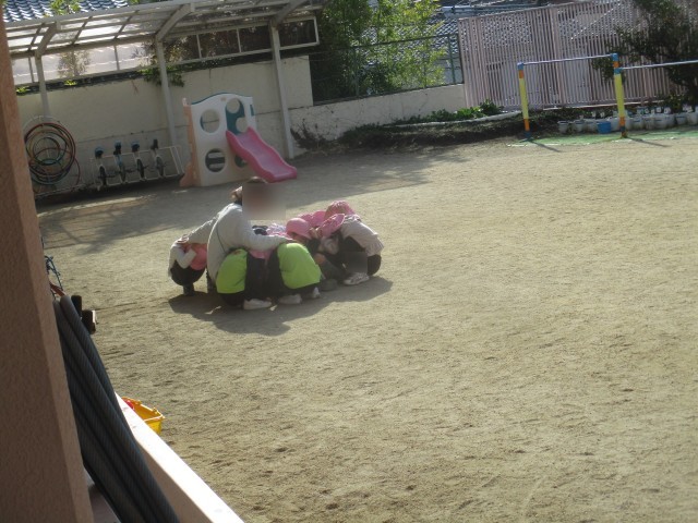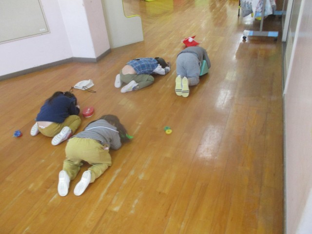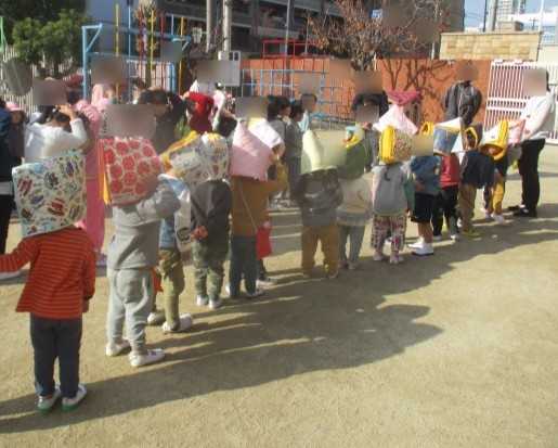 春から繰り返してきた避難訓練で、防災頭巾の扱い方や静かに先生のところに集まることが、とても早くなった子どもたちです。