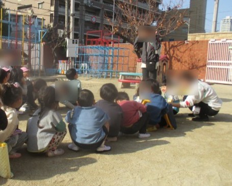 放送の声を聞き近くの先生のところへ集まった後は、みんなが園庭に避難し、地震の避難についてのお話を聞きました。