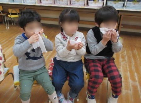 子どもたちは、ポケットティッシュをそーっと広げ、片方ずつ鼻をかんでいました。