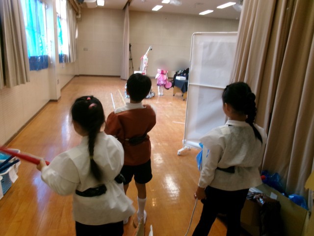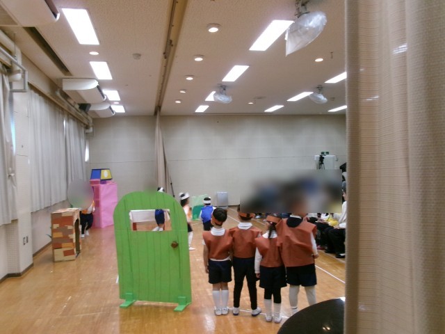 「さぁ、いよいよ始まるよ」すみれ組はリズム室に向かう前に「エイエイ オー!」と気合を入れて。舞台裏の準備も大忙しでした。