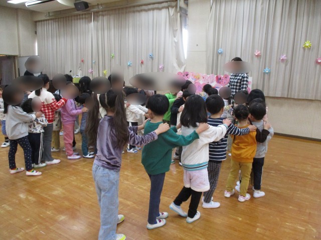 お別れ会では、「ゆらゆらブランコ」と「かもつれっしゃ」というふれあい遊びをしたり