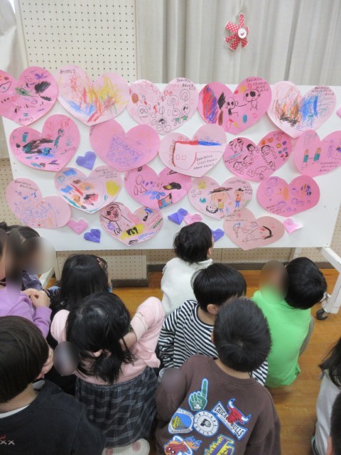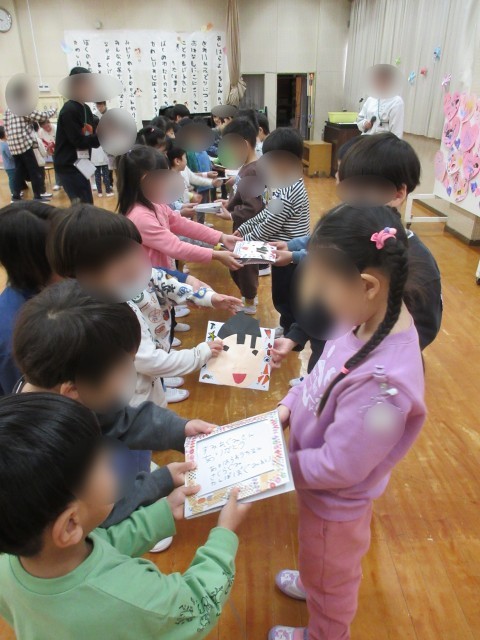 さくら組とたんぽぽ組の子どもたちは、「すみれ組さんに『ありがとう』を伝えたい。」と、今日までプレゼントや、お花をつくったり、ハートの手紙をかいたりして準備をしてきました。