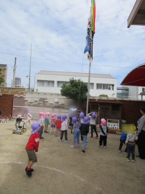 すみれ組の子どもたちがこいのぼりを揚げました。