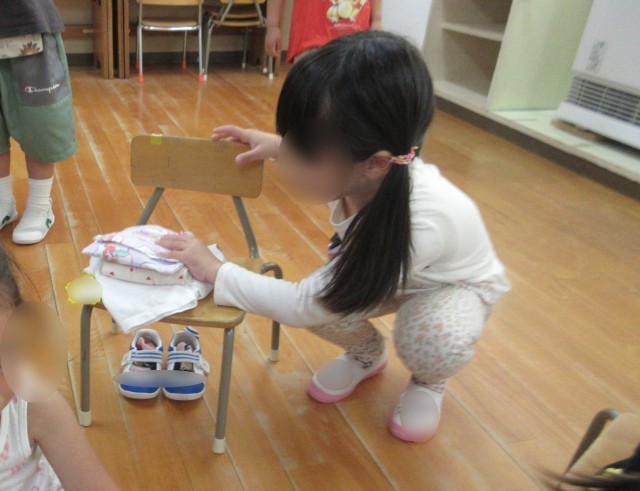小さくかがんでボタンを外したり、裏返しになった服をたたんだりしてくれたすみれ組さんでしたが、測定後に靴下を履かせるのにはひと苦労。それでも動くたんぽぽ組さんの足に合わせて、靴下の向きを考えながら上手に履かせてくれました。