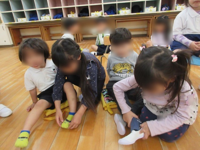 一方、いつもは自分で履いている上靴も、履かせてもらってご満悦のたんぽぽ組さん。「おおきくなったね」の声に嬉しそうな笑顔をみせていました。
